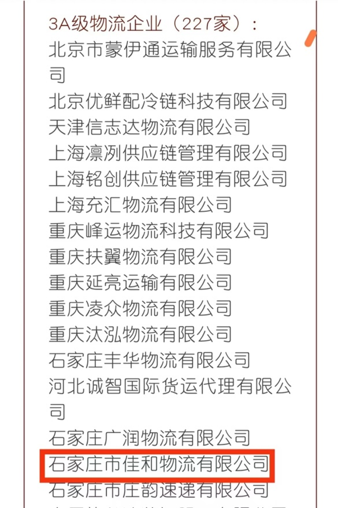 近日,中国物流与采购联合会物流企业综合评估委员会公布了第33批A级物流企业名单,石家庄市佳和物流有限公司获批3A级物流企业。