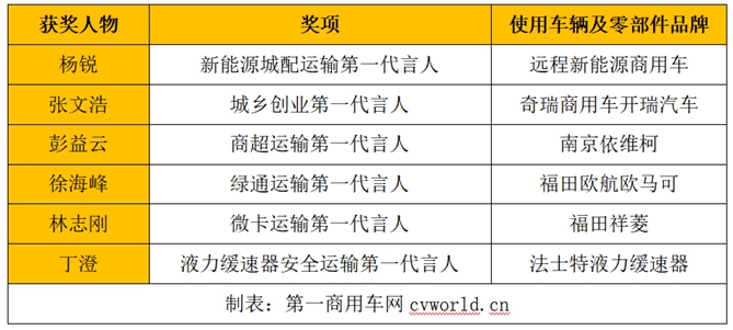 这6位“第一代言人”分别是:“新能源城配运输第一代言人”杨锐、“城乡创业第一代言人”张文浩、“商超运输第一代言人” 彭益云、“绿通运输第一代言人”徐海峰、“微卡运输第一代言人”林志刚、“液力缓速器安全运输第一代言人”丁澄。