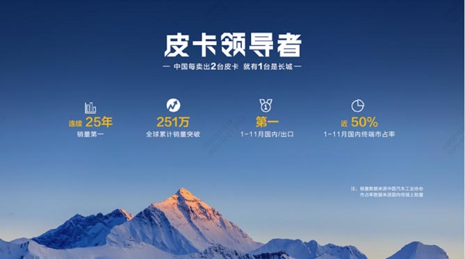 作为皮卡领导者,长城皮卡连续25年销量第一,全球累计销量突破251万台。今年1-11月全球累计销售突破18.6万台,斩获国内、出口销量双第一,国内终端市占率近50%,中国每卖出两台皮卡,就有一台是长城。长城炮品牌四周年,更成为首个突破50万台的中国高端皮卡品牌,创造新的“长城炮速度”,持续引领中国皮卡向上。